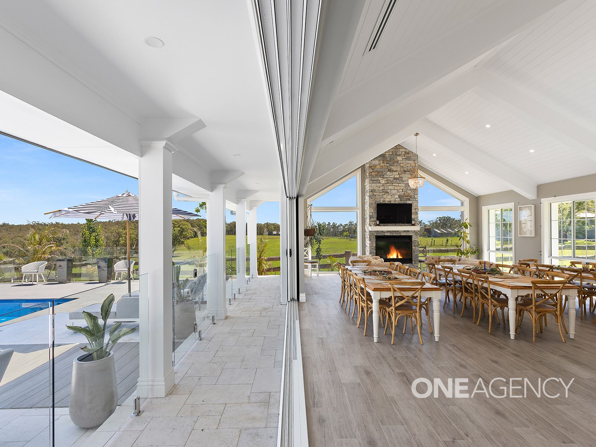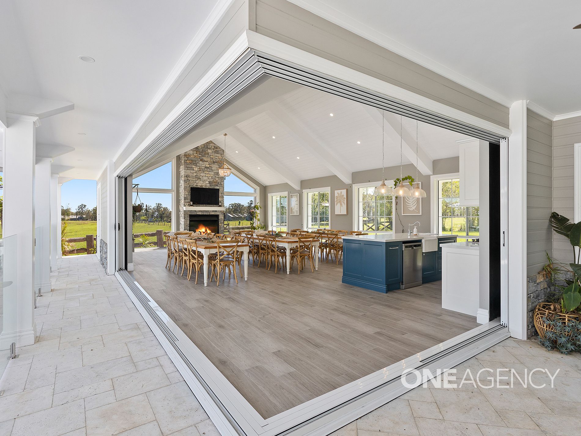 - Expansive living and dining areas with a striking fireplace and panoramic property views
