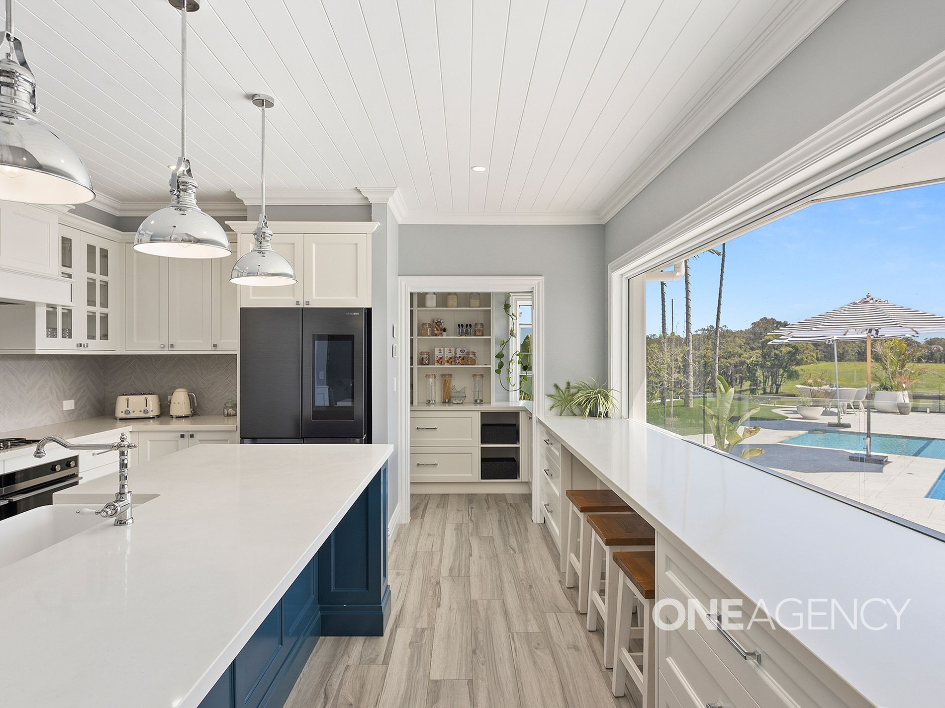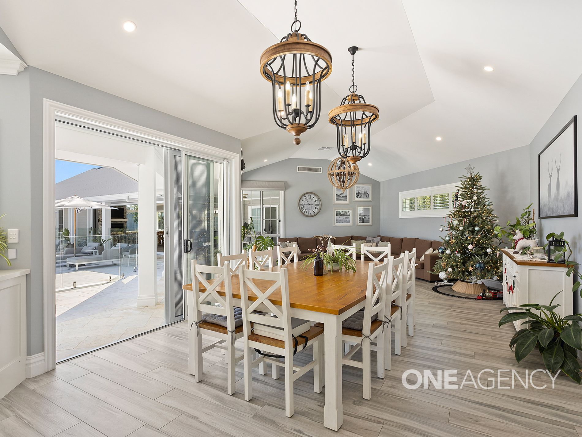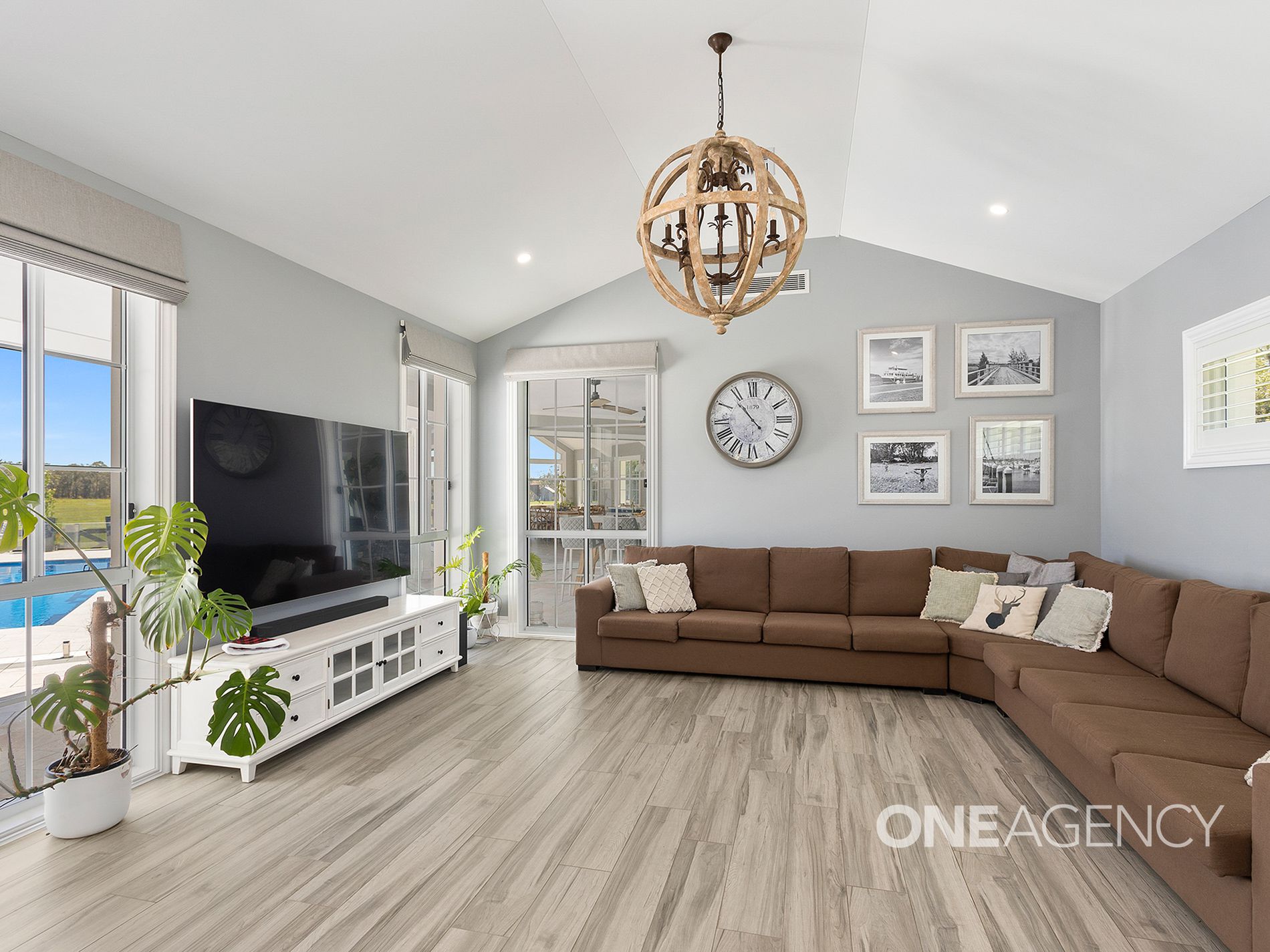 At the heart of the home, a stunning kitchen awaitsan entertainers dream featuring a central island bench, top-of-the-line appliances, and bespoke finishes, making it as functional as it is beautiful. The open-plan living and dining areas boast high cathedral ceilings and a grand fireplace, framing panoramic views that create a sense of serenity and grandeur. The seamless flow from the indoors to the outdoor living areas ensures a perfect connection to the natural beauty of the estate.