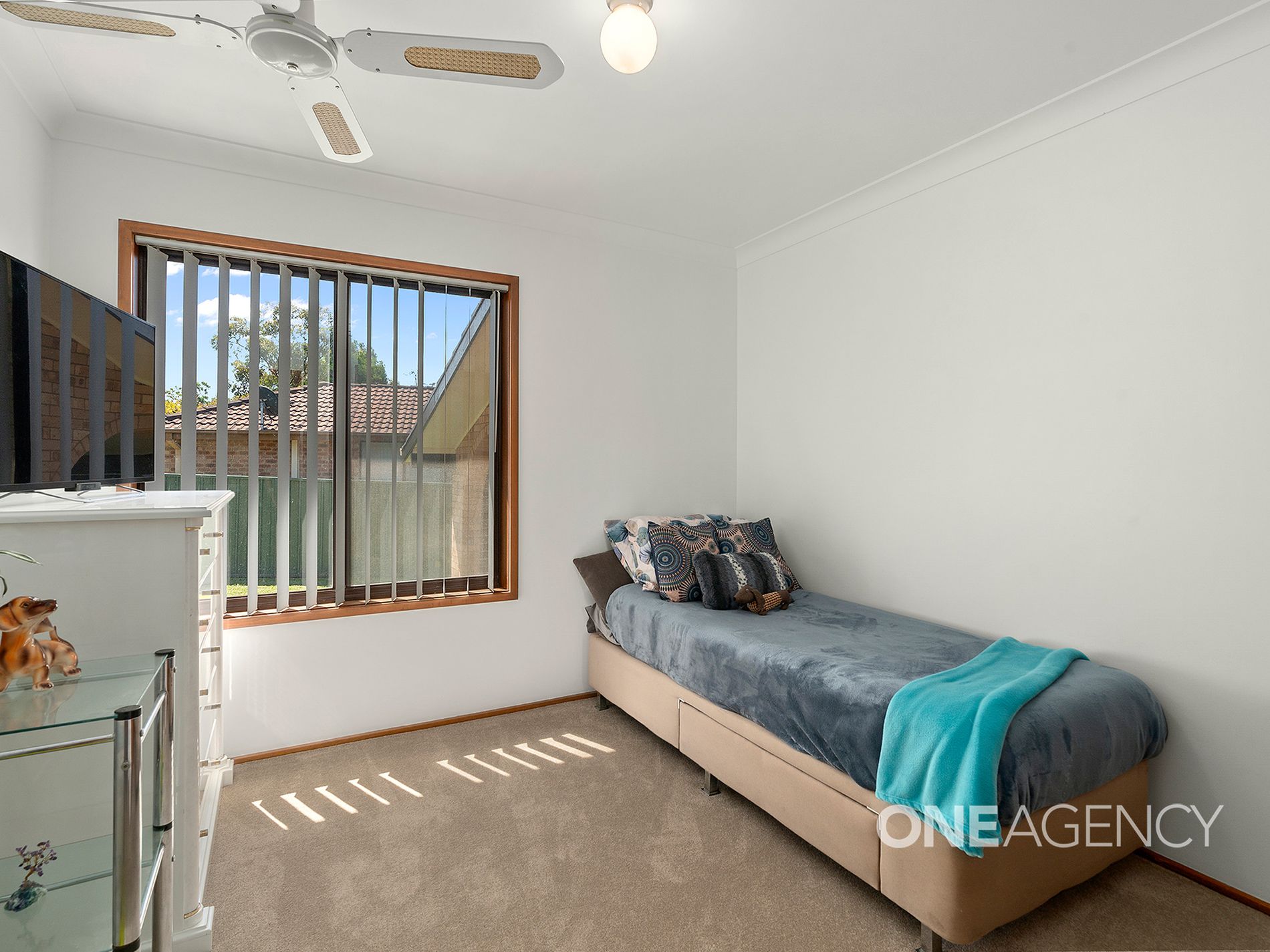 - Three carpeted bedrooms, all with ceiling fans, two with built-ins