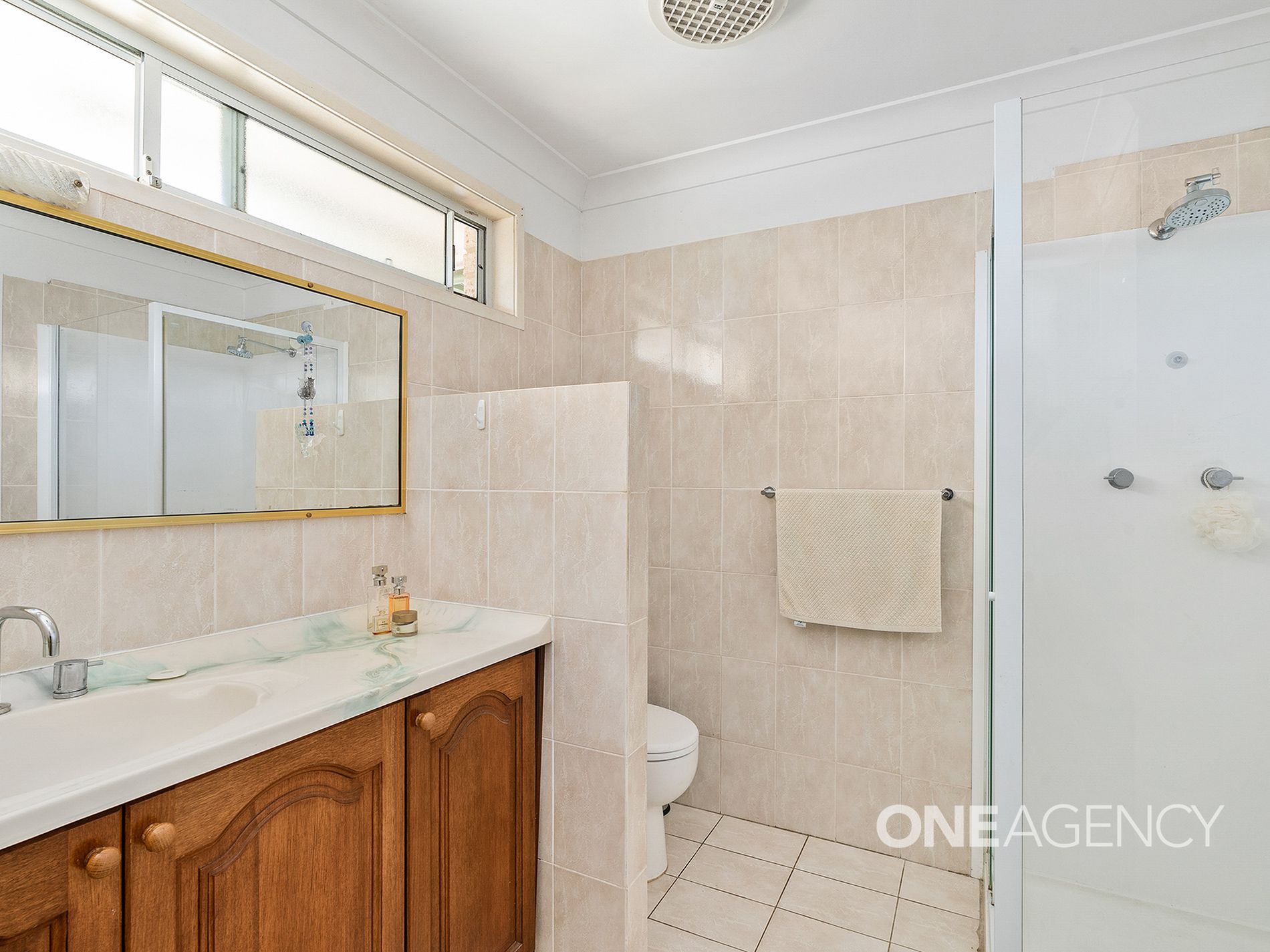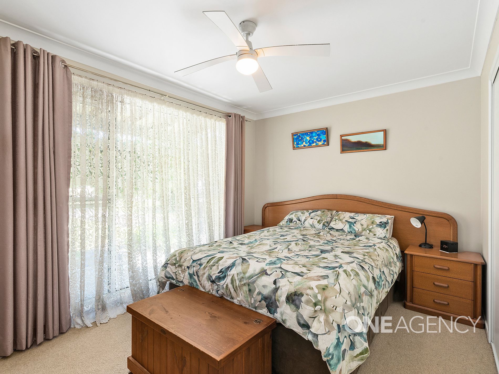 Featuring three light-filled and well-maintained bedrooms, all carpeted with ceiling fans for year-round comfort, this home is designed for easy living. Two of the bedrooms include built-in wardrobes, while the original bathroom offers a practical layout with a shower and large vanity.