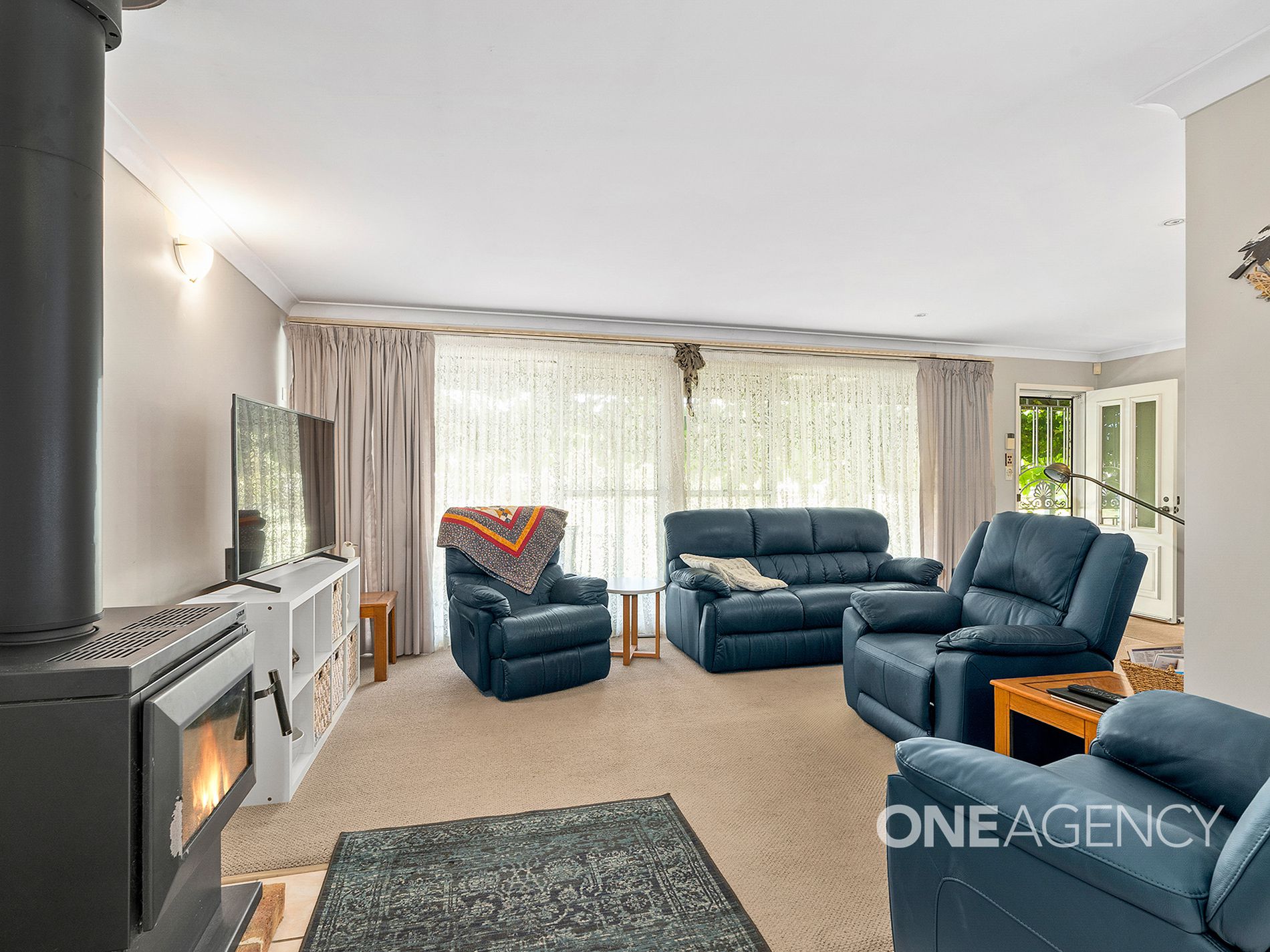 - Light-filled living area with wood-burning fireplace