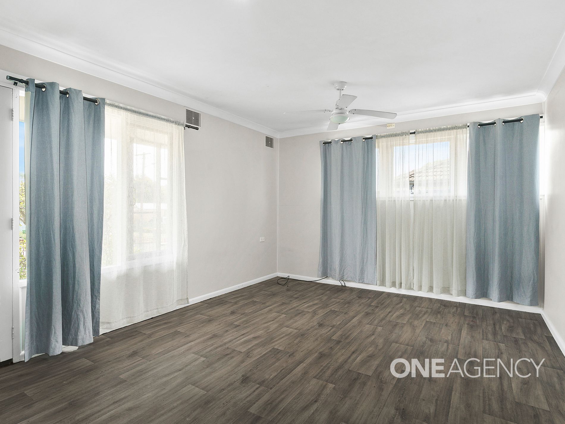 - Light-filled living room with ceiling fans