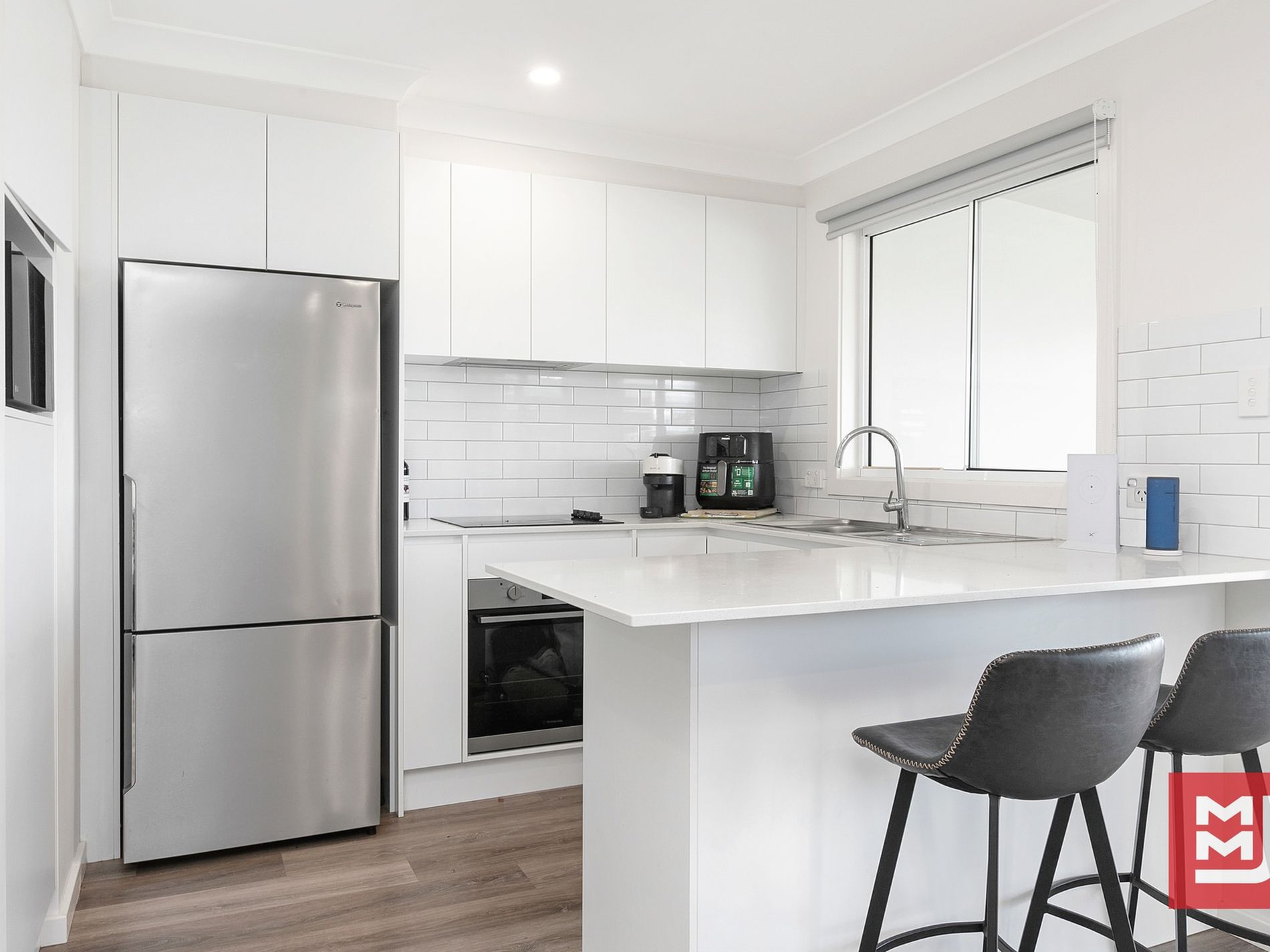 The front dwelling welcomes you with its timeless elegance, boasting renovated interiors that invite you to linger. Open-plan living spaces and lofty ceilings create a welcoming atmosphere, while glimpses of distant horizons through the windows add to the allure.