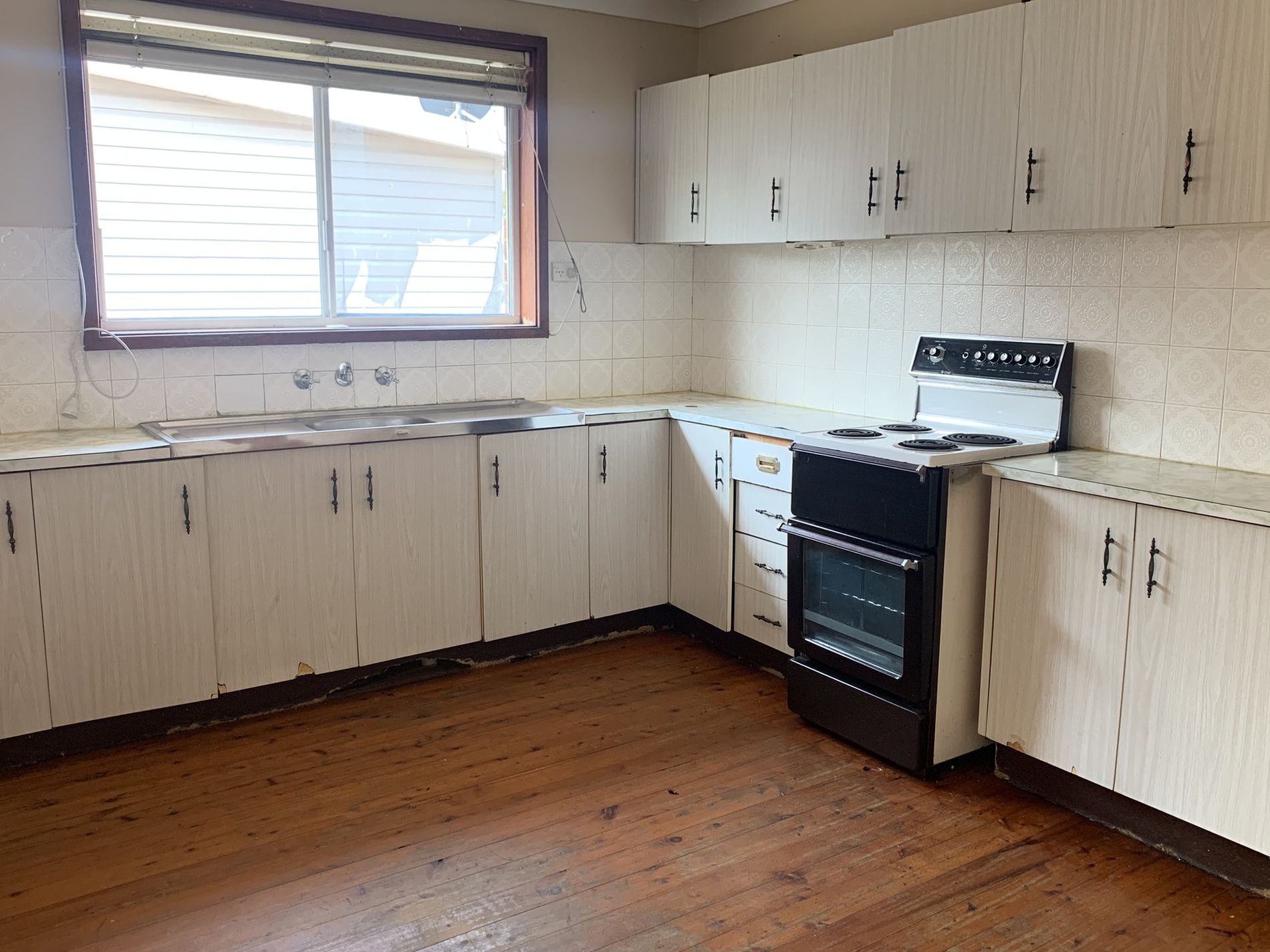 - Large older style kitchen with electric cooking appliances