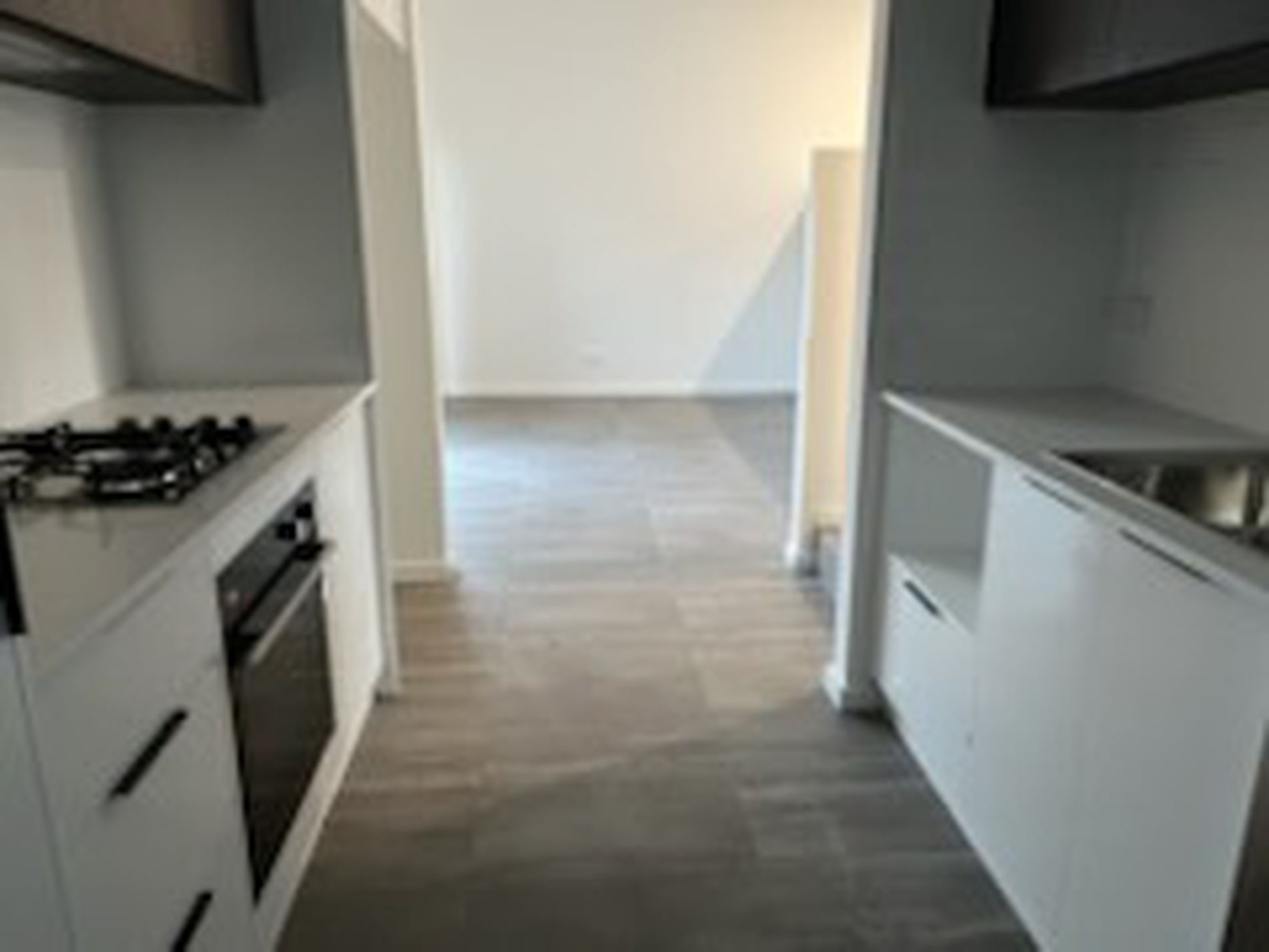 - Sleek galley style kitchen with stainless steel appliances and dishwasher