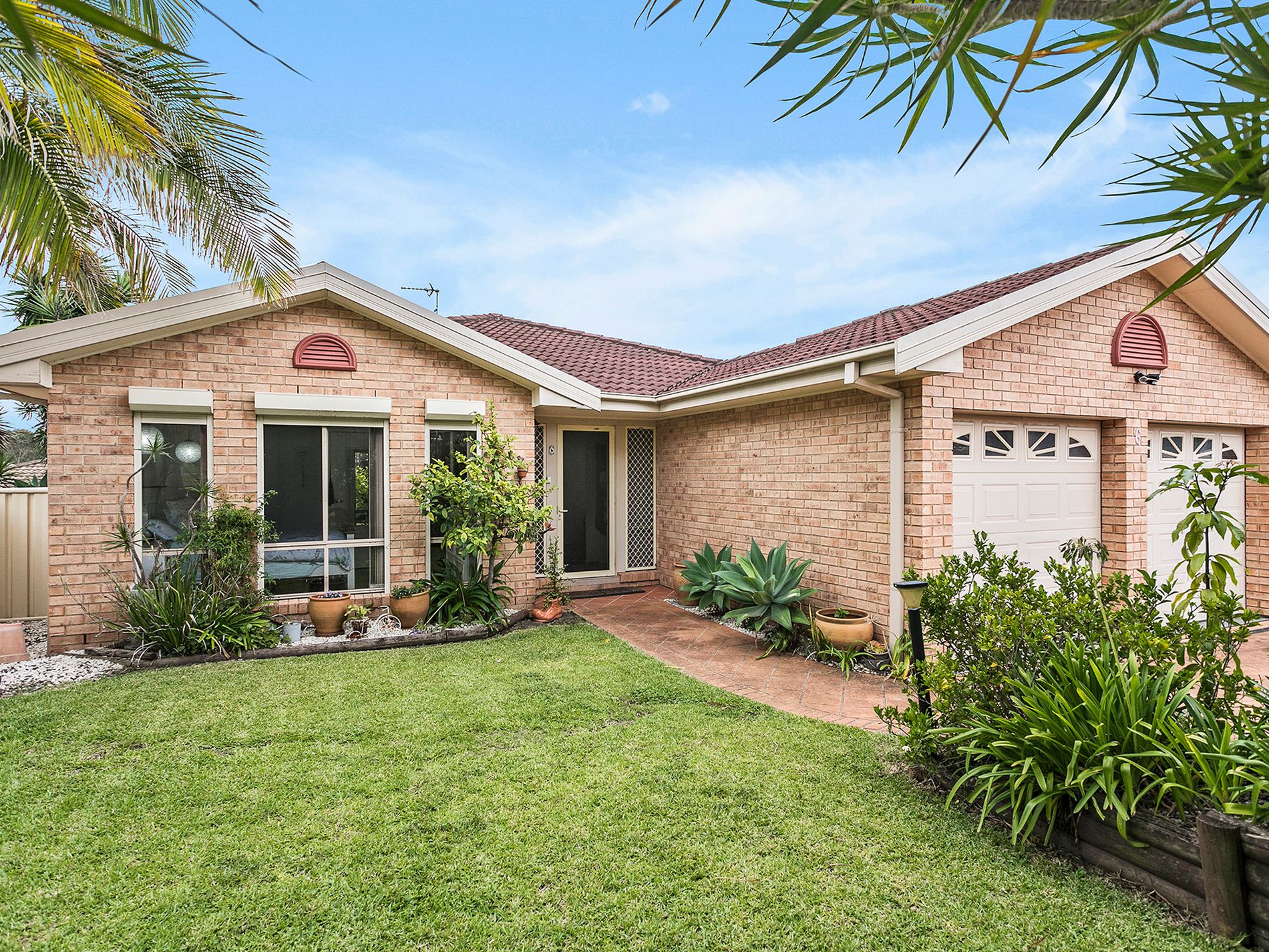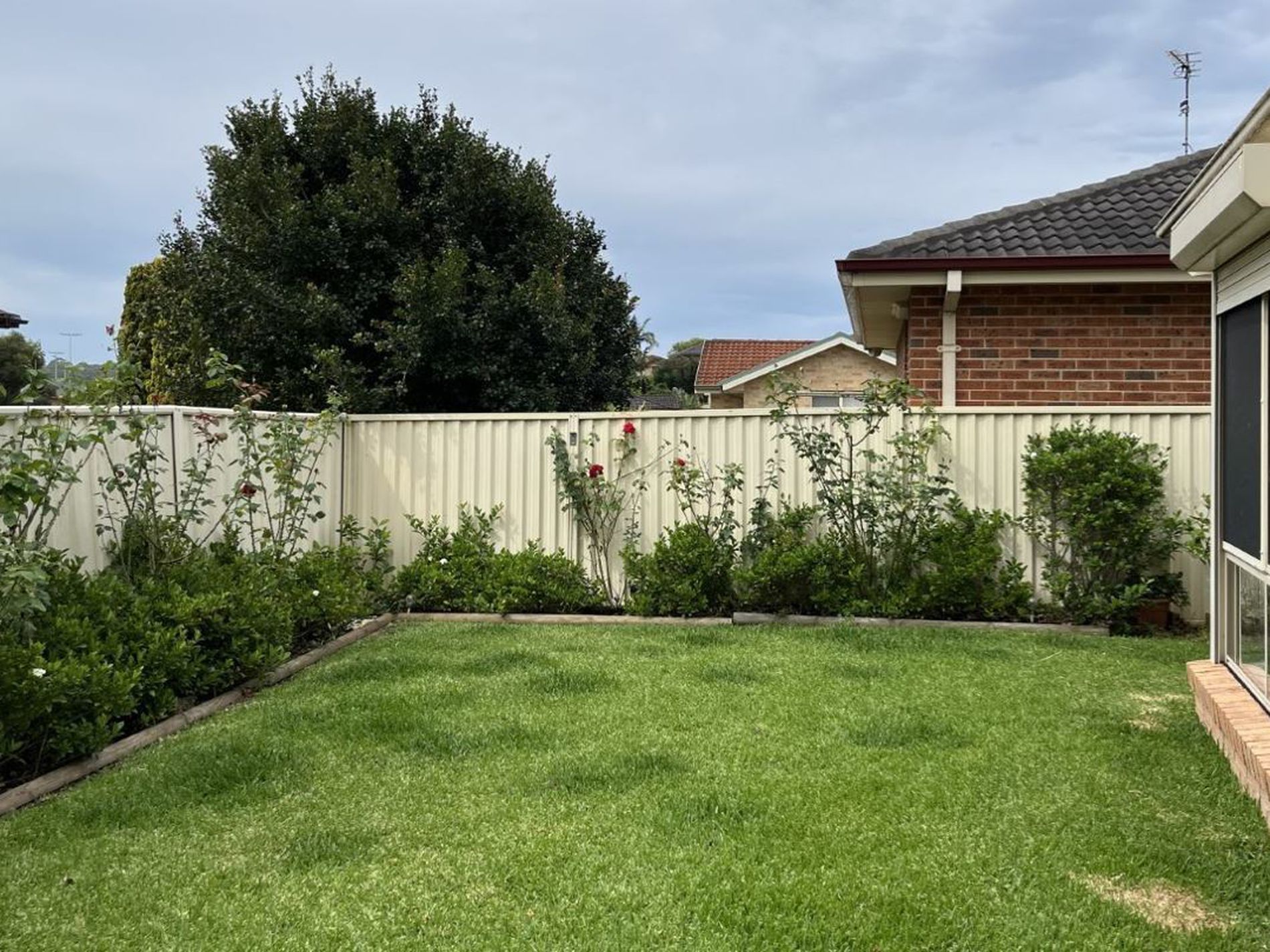 - Large fully fenced yard with manicured gardens and garden shed