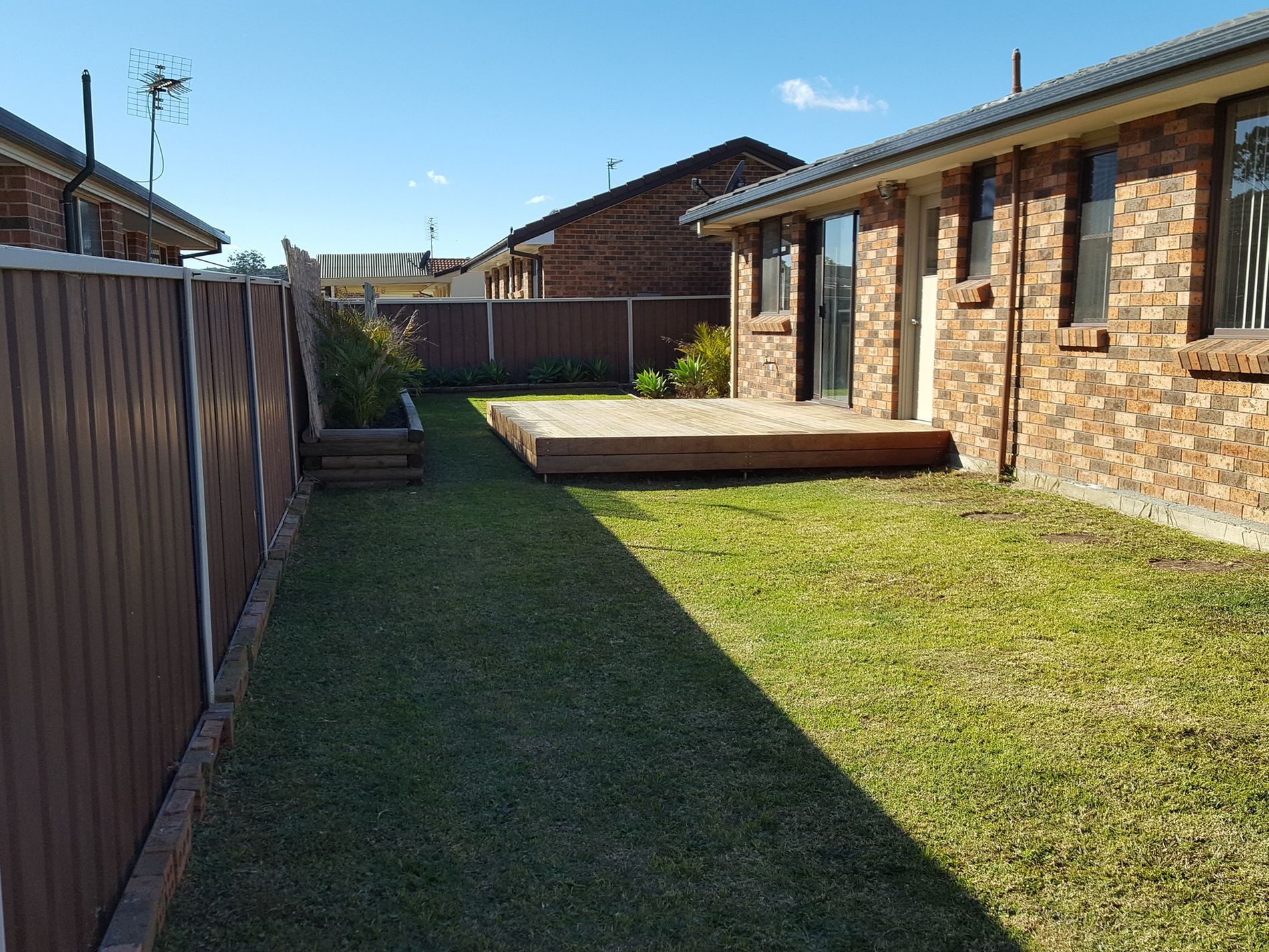- Fully fenced back yard with sun deck
