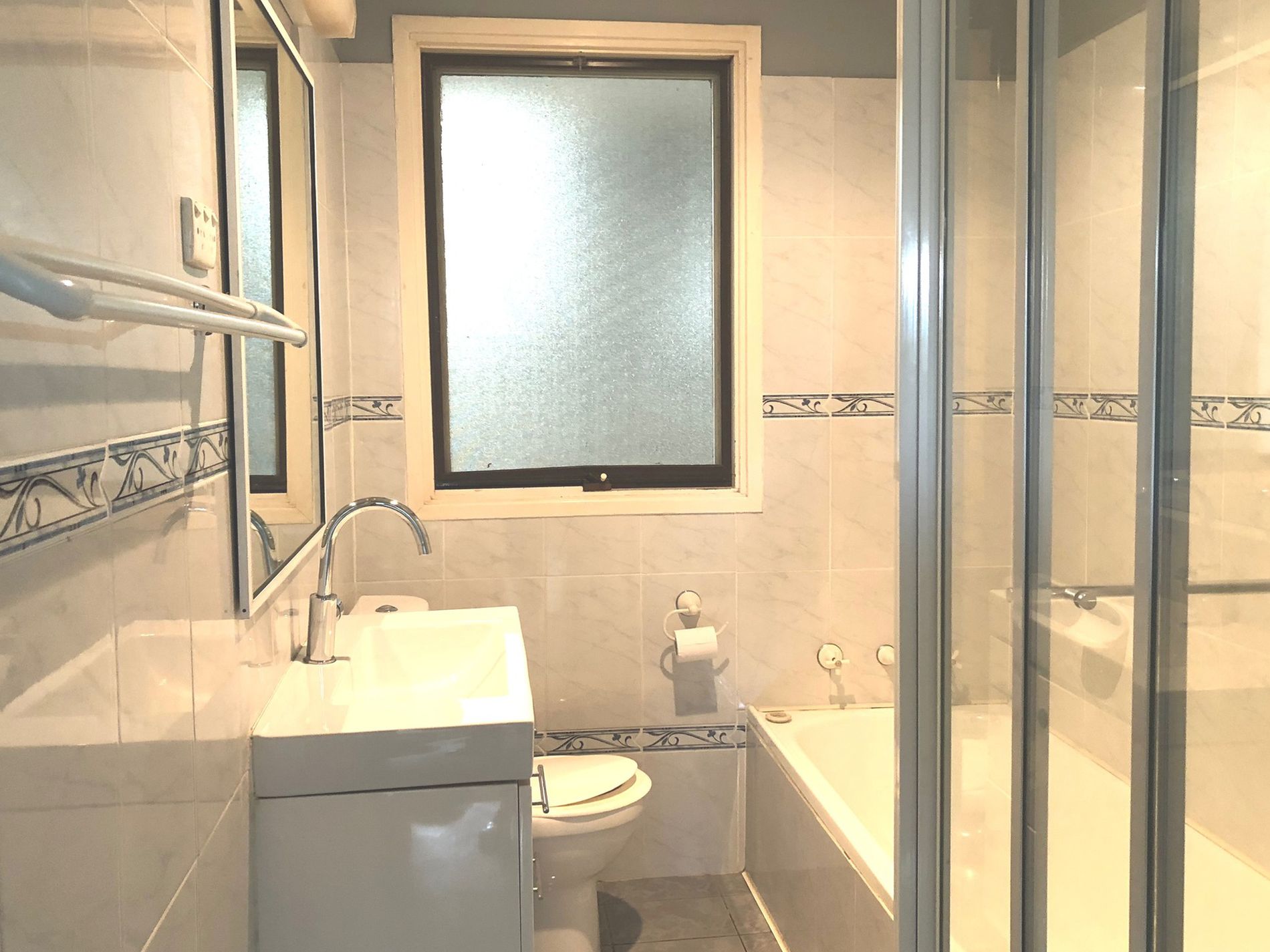 - Bathroom features floor-to-ceiling tiles and bath tub