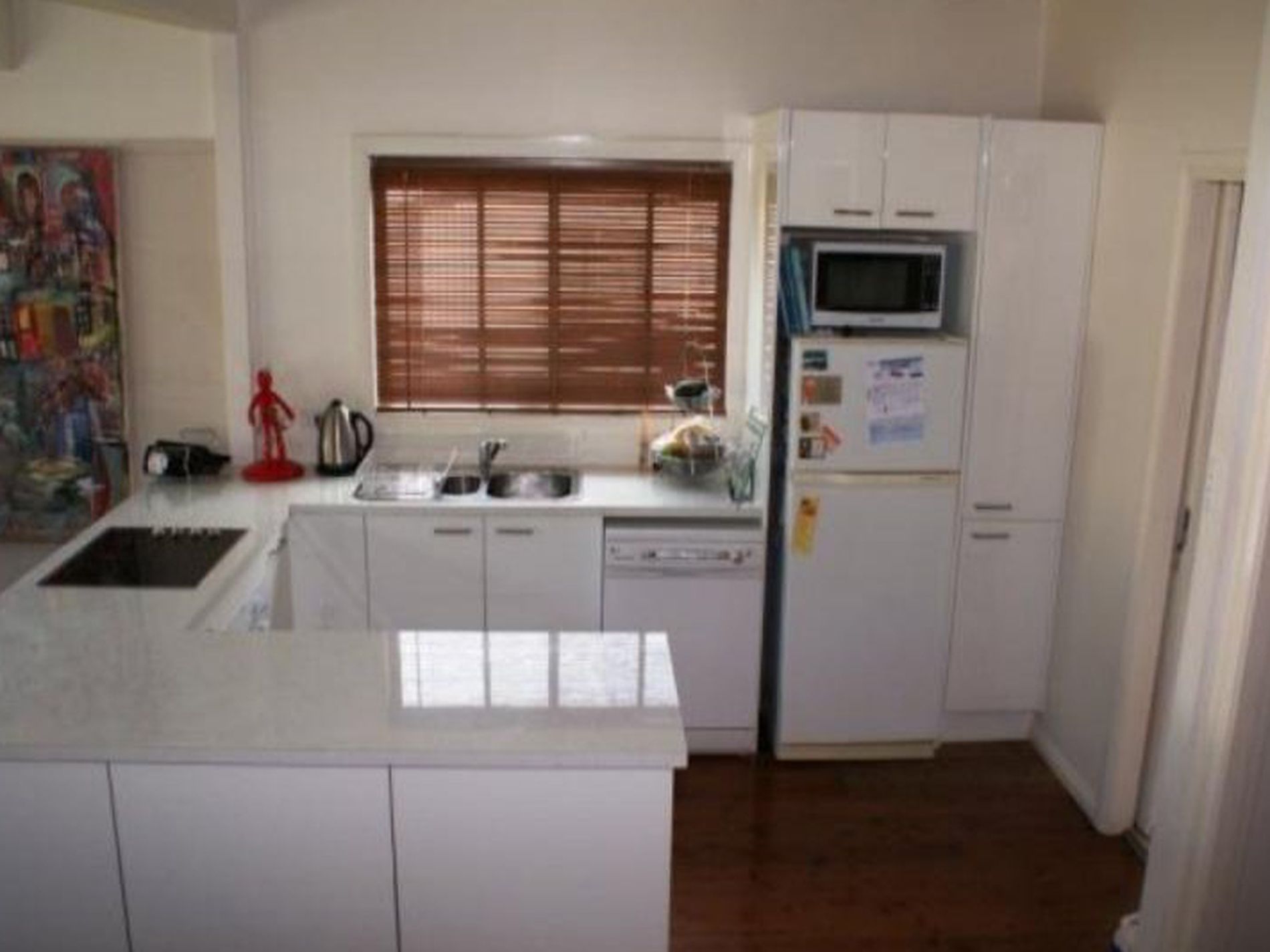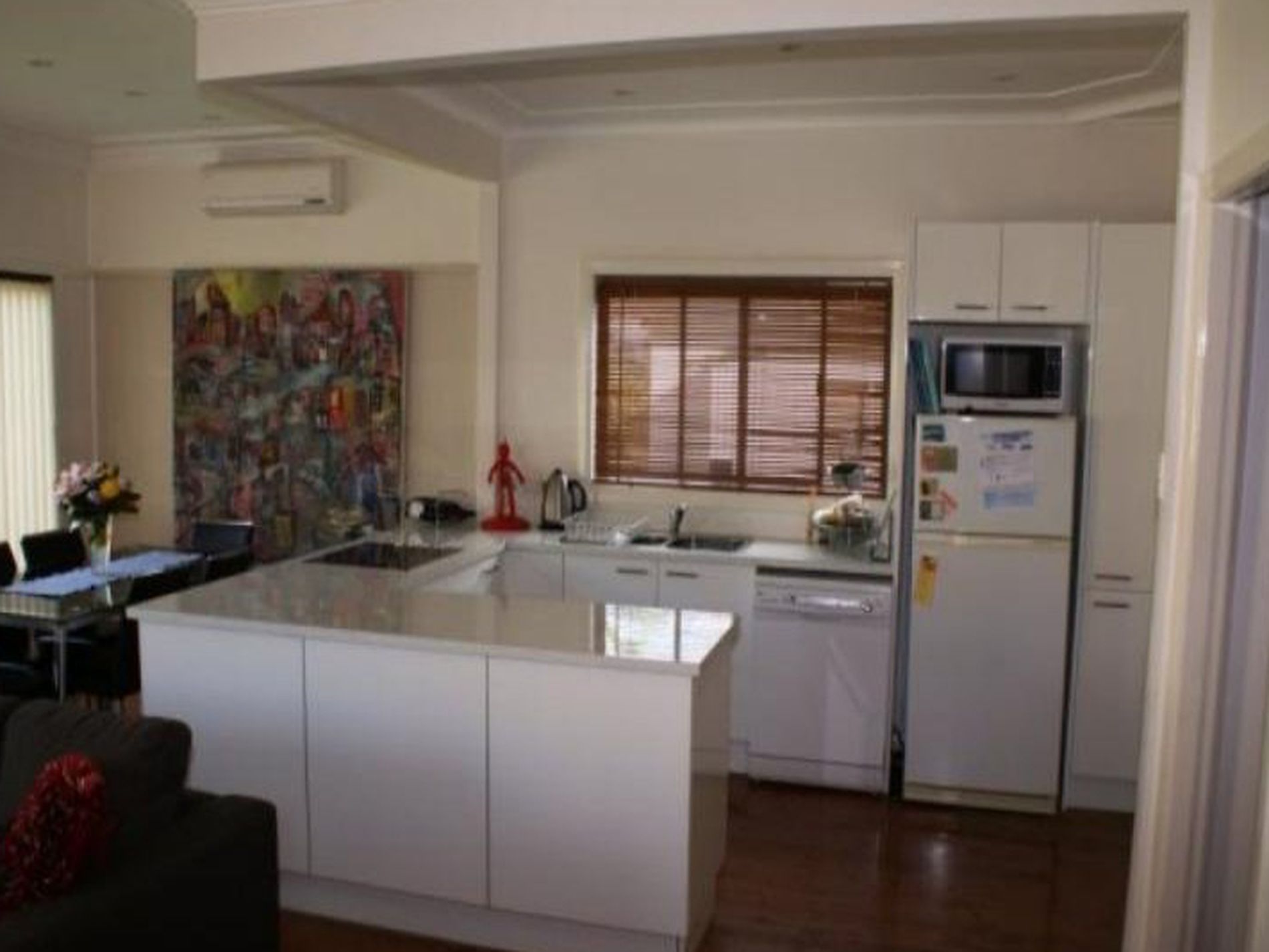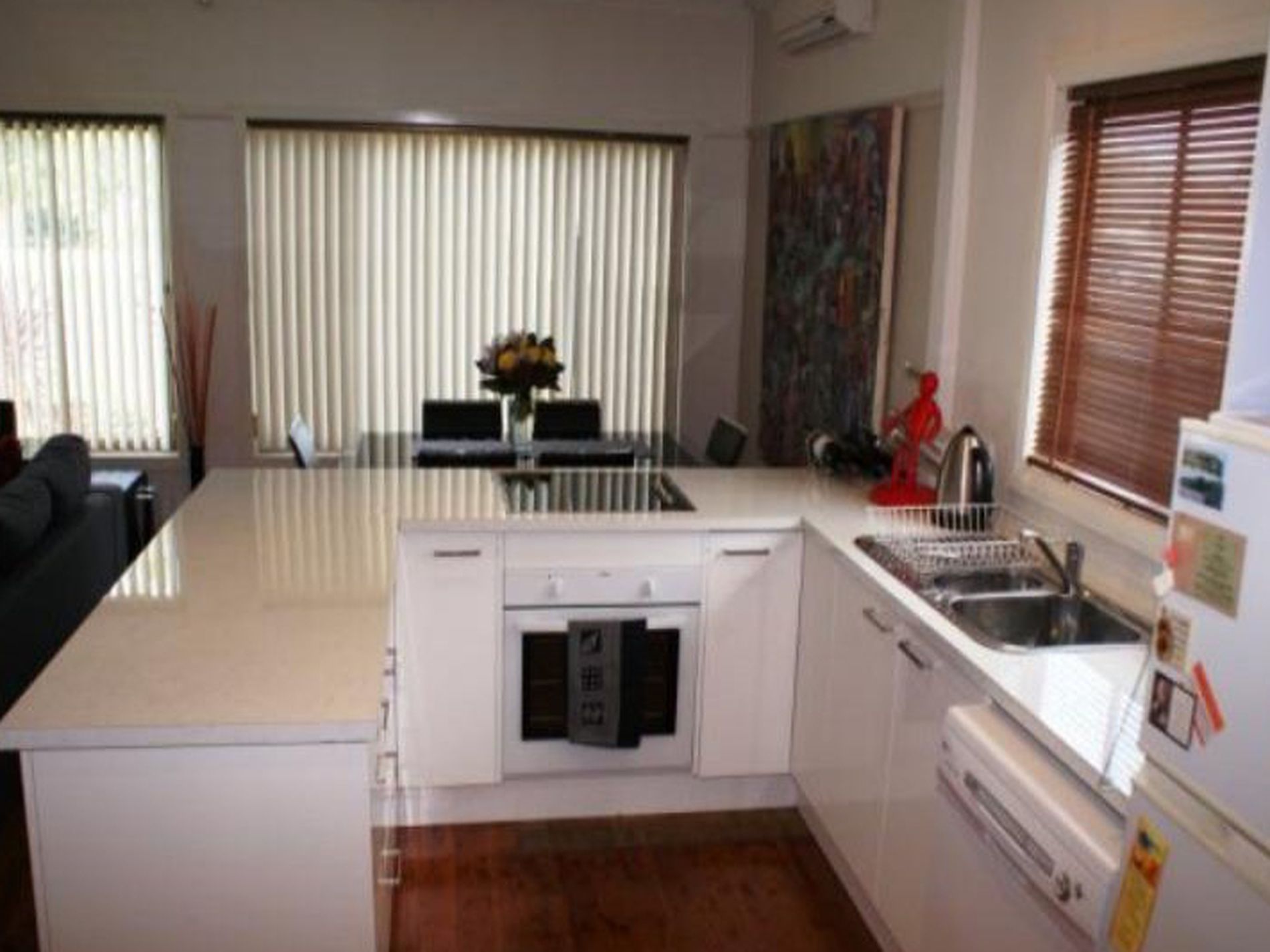 - Modern white kitchen, with a breakfast bar and plenty of cupboard space.