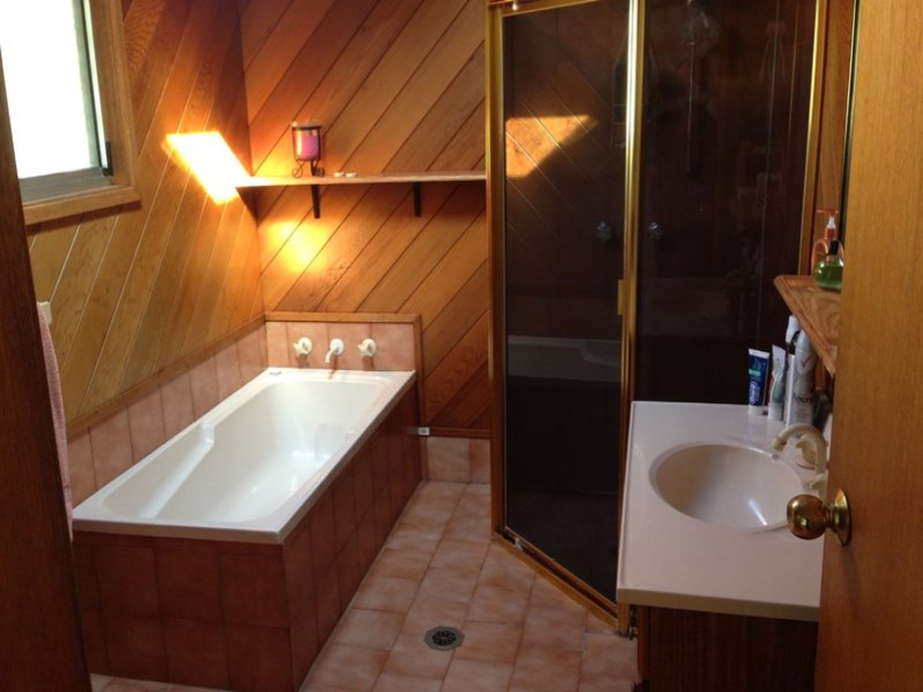 - Modern timber bathroom with full size bath and separate shower