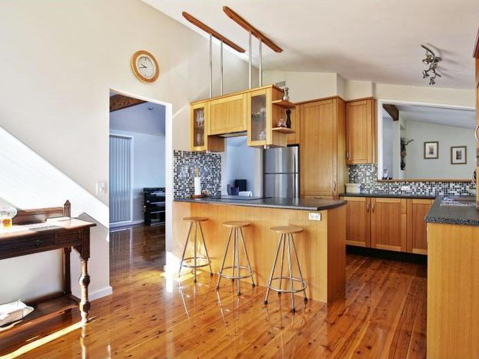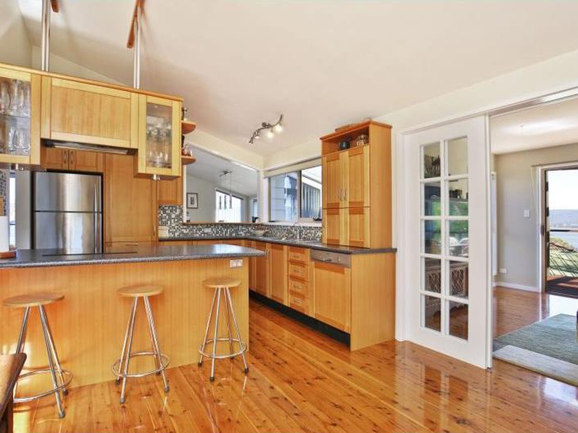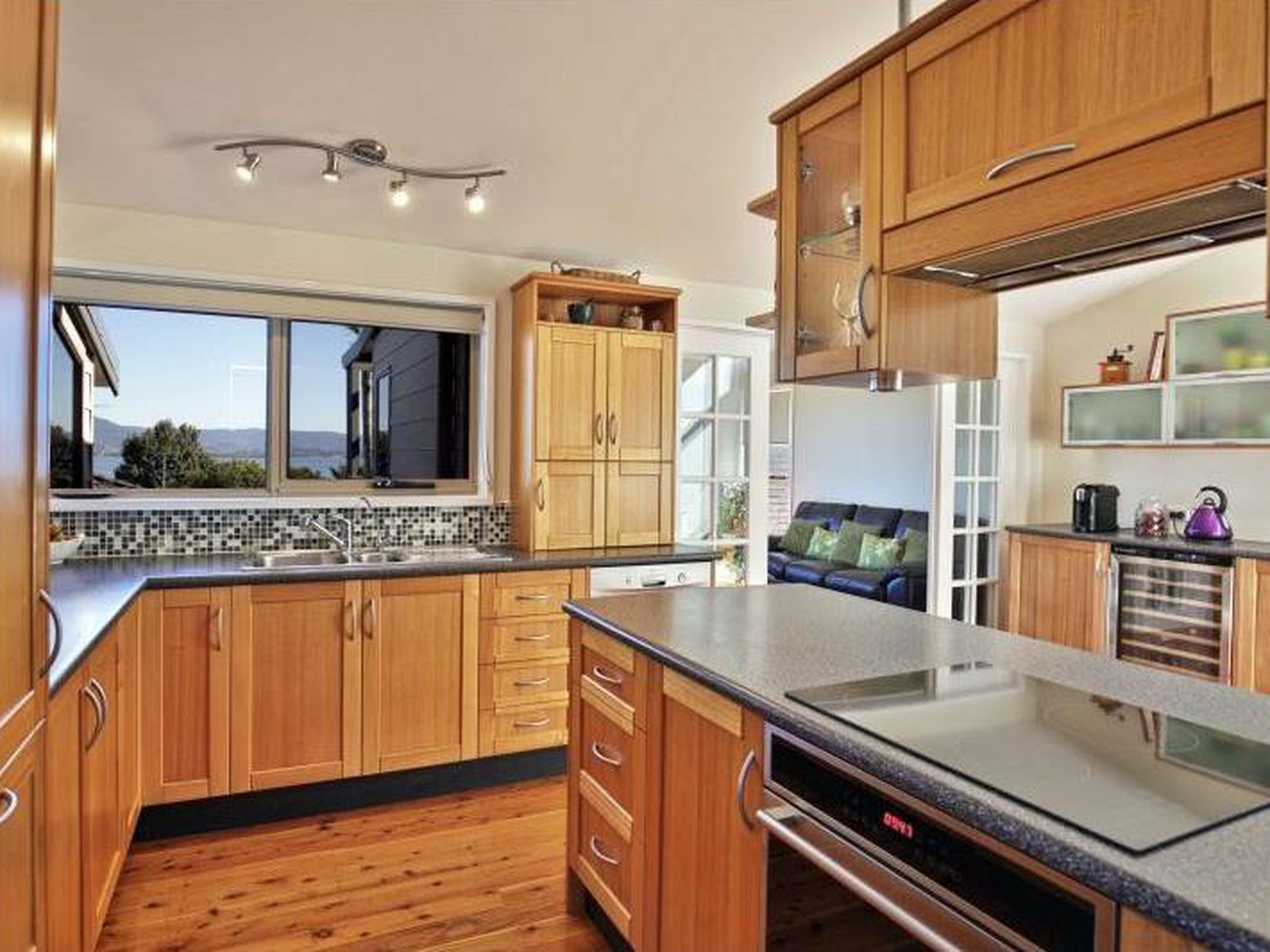 - Timber kitchen with stainless steel appliances