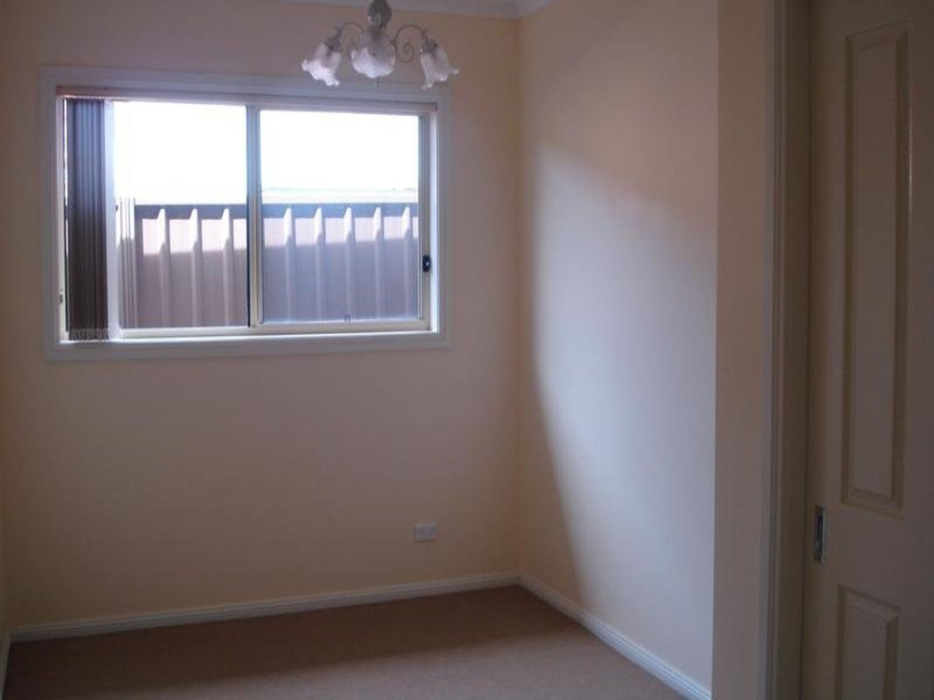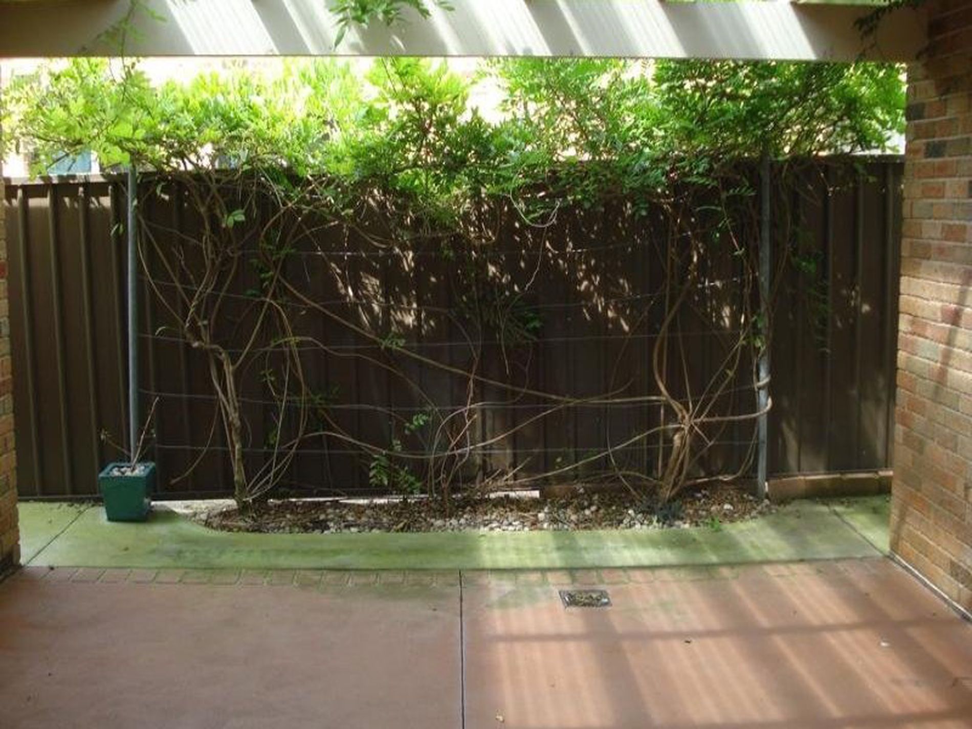- Painted concrete courtyard with pergola, enclosed yard.