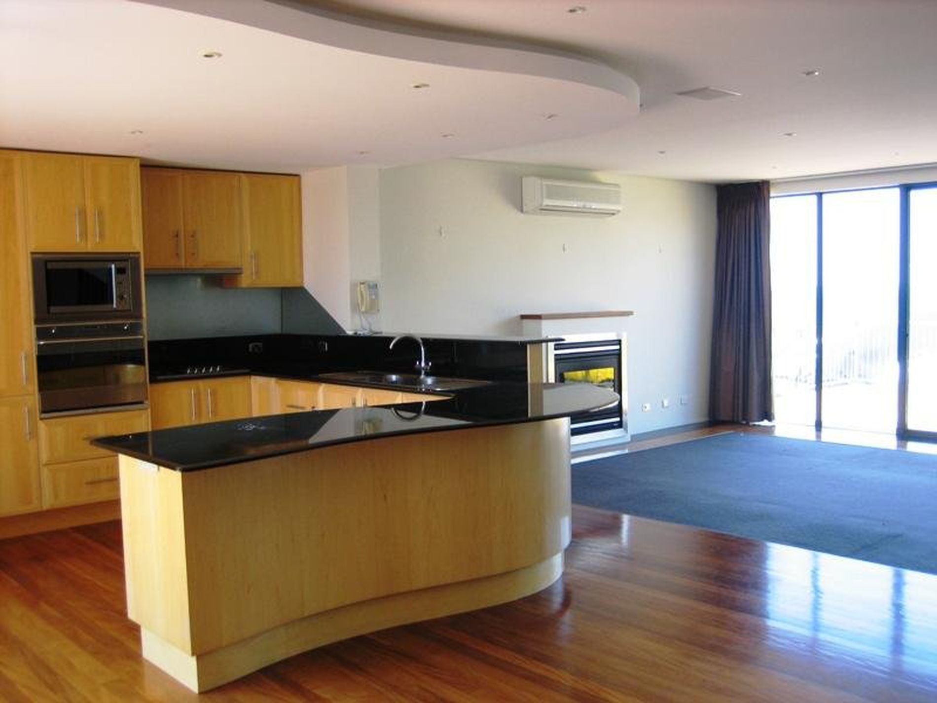 - Open plan gourmet kitchen with stainless steel appliances