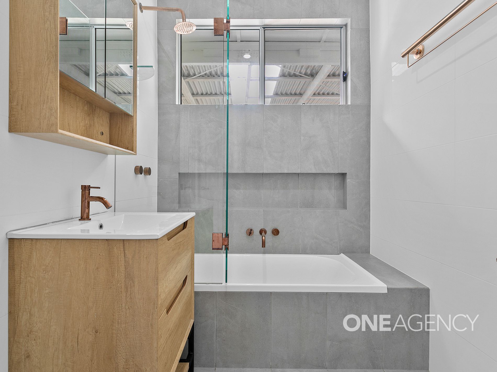 - Stylish renovated bathroom with rose gold tapware