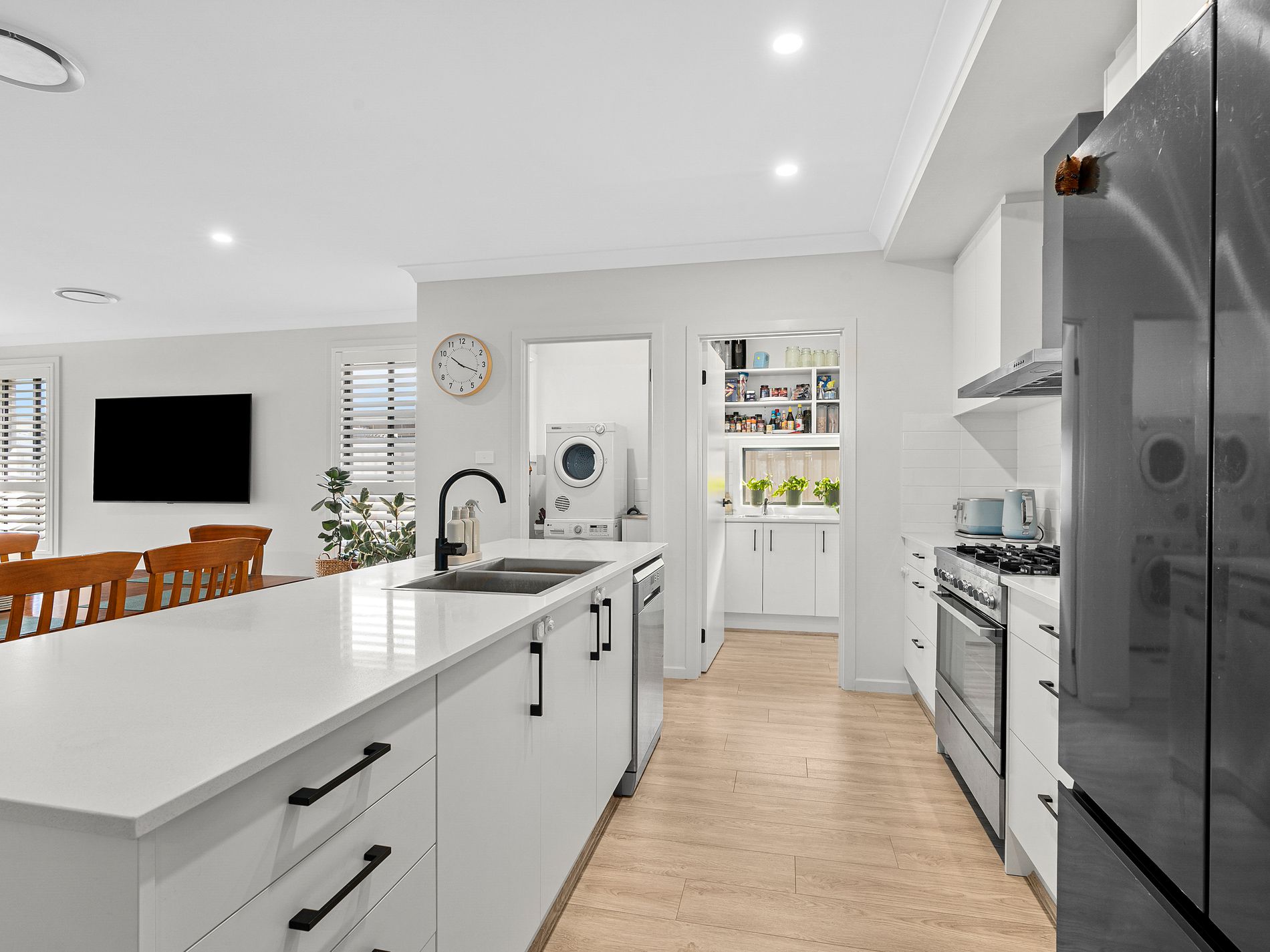 The kitchen is sure to impress. Stone benchtops, a large island, soft close drawers and a freestanding 900mm five-burner gas cooktop make it a great space for cooking and entertaining in an open plan setting. The butler’s pantry adds extra storage and keeps the mess out of sight (something every kitchen appreciates), finished with a sleek glass splashback.