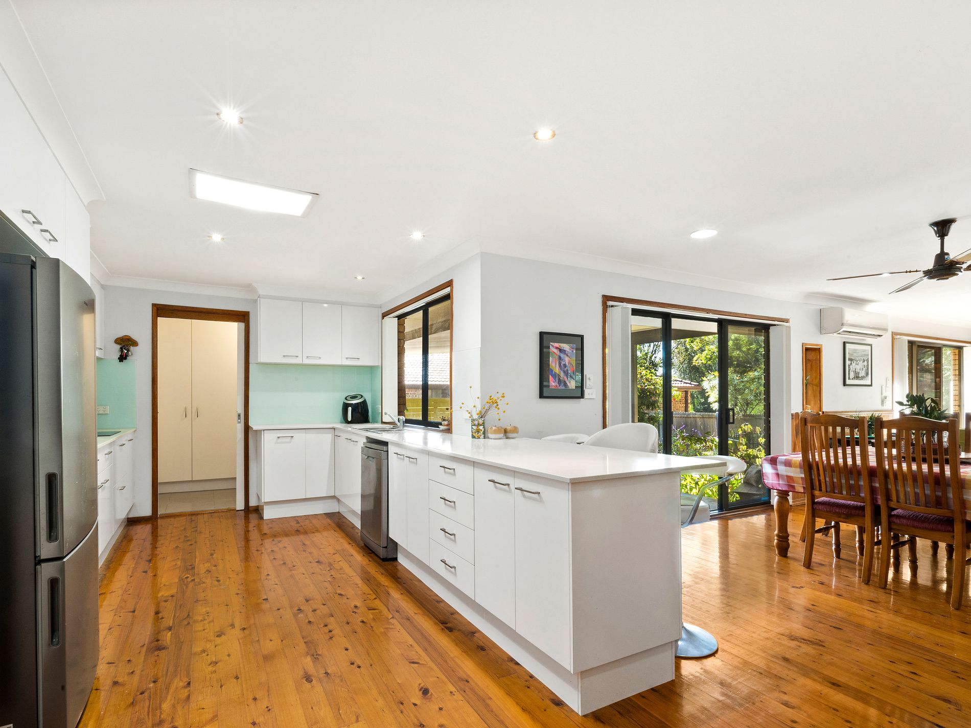 All four bedrooms are well-sized and filled with natural light, each complete with built-in wardrobes and ceiling fans for added comfort. The updated bathrooms are modern and well-appointed, with the main featuring a double head shower and excellent storage options. Every element has been carefully considered to deliver both style and functionality.
