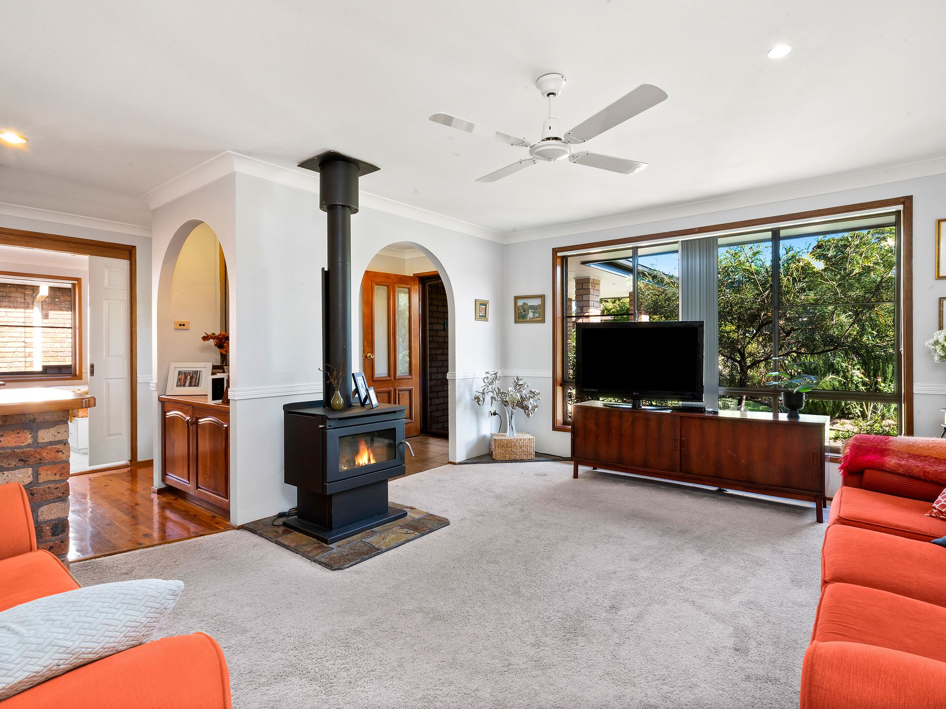 - Two light-filled living areas including fireplace and wood heater