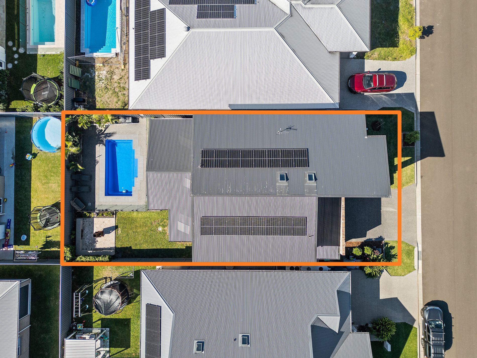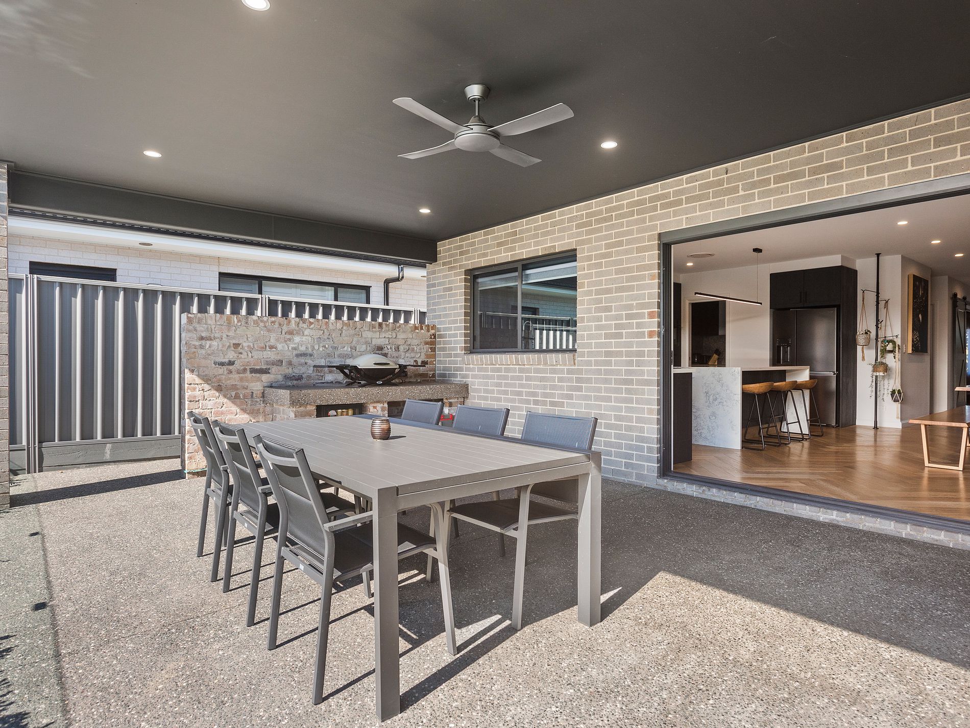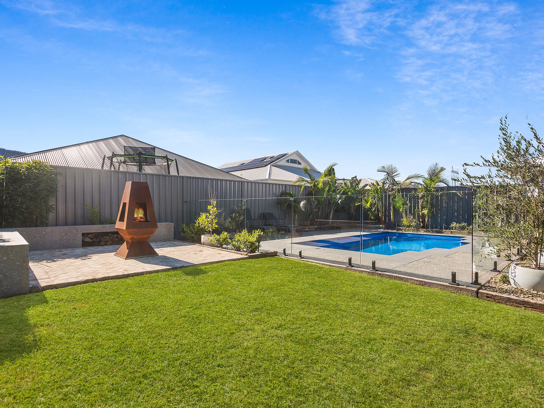 - Covered alfresco overlooking heated inground pool, outdoor shower, firepit zone and grassed yard