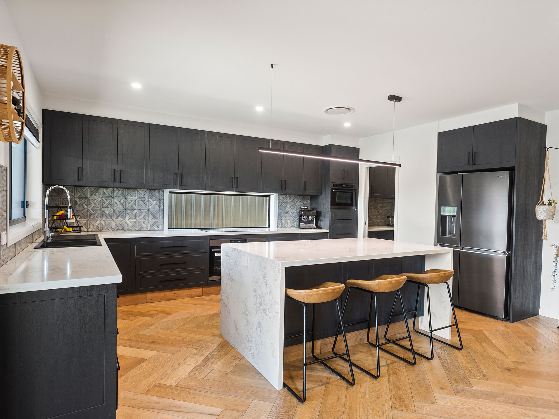 Accommodation includes four spacious bedrooms, each designed for comfort, function and modern family living. The master suite is a true private retreat with blackout blinds, walk-in robe, elegant ensuite with vanity and double shower heads, while the remaining bedrooms include built-in robes, built-in desks or vanities, ceiling fans and ducted air.