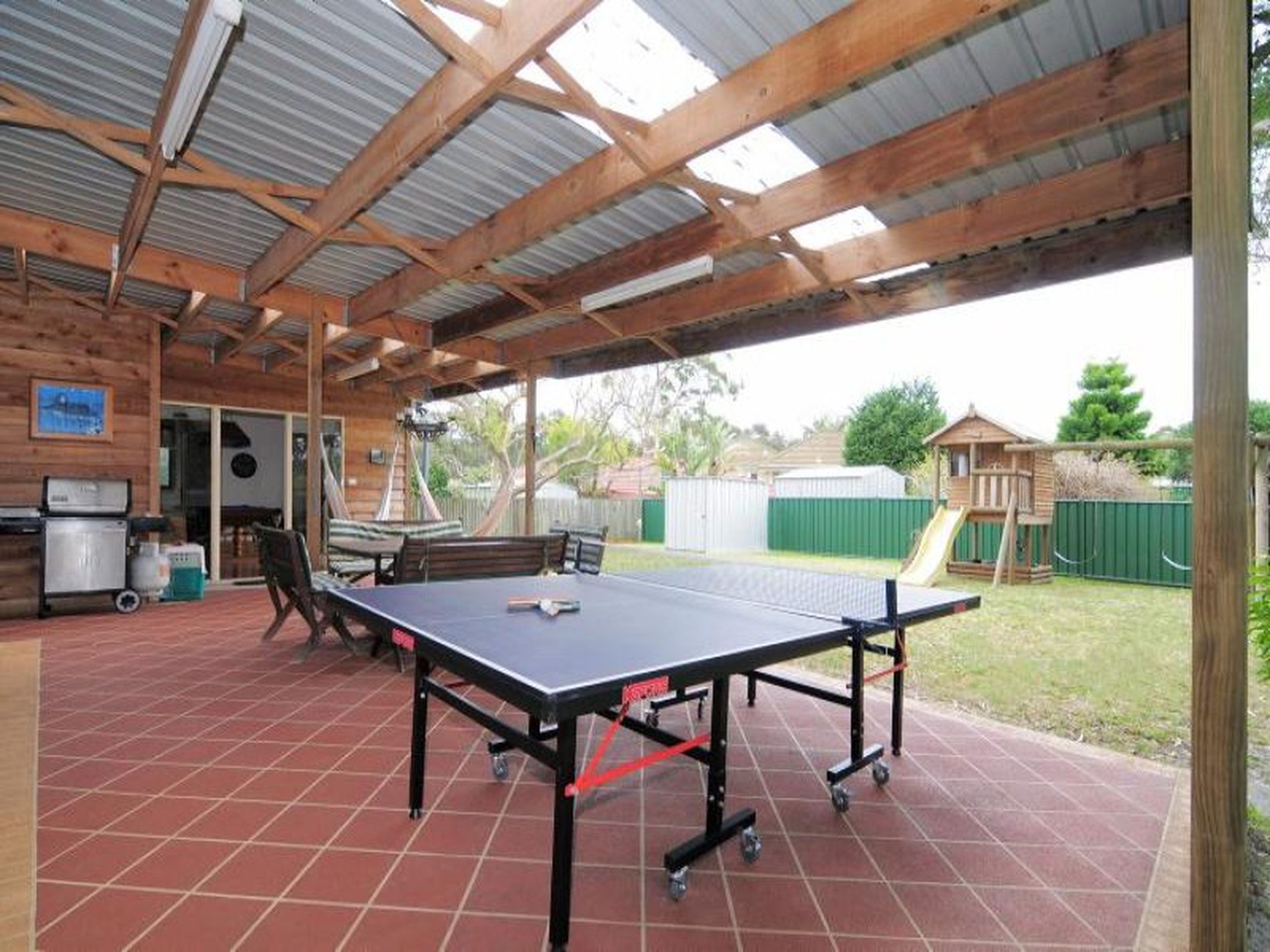 Large covered outdoor entertaining area, level yard with childrens play area.