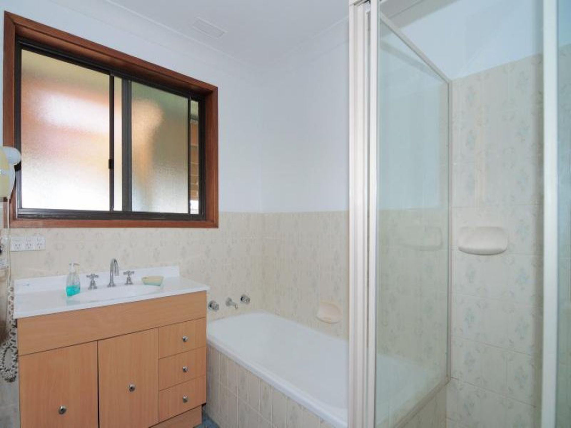 Second bathroom with shower, toilet and vanity, accessed outside from the covered entertaining area.