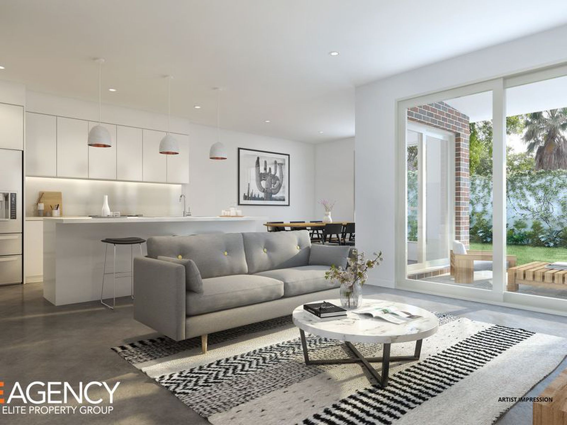 - Kitchen, living and dining area feature polished concrete floors