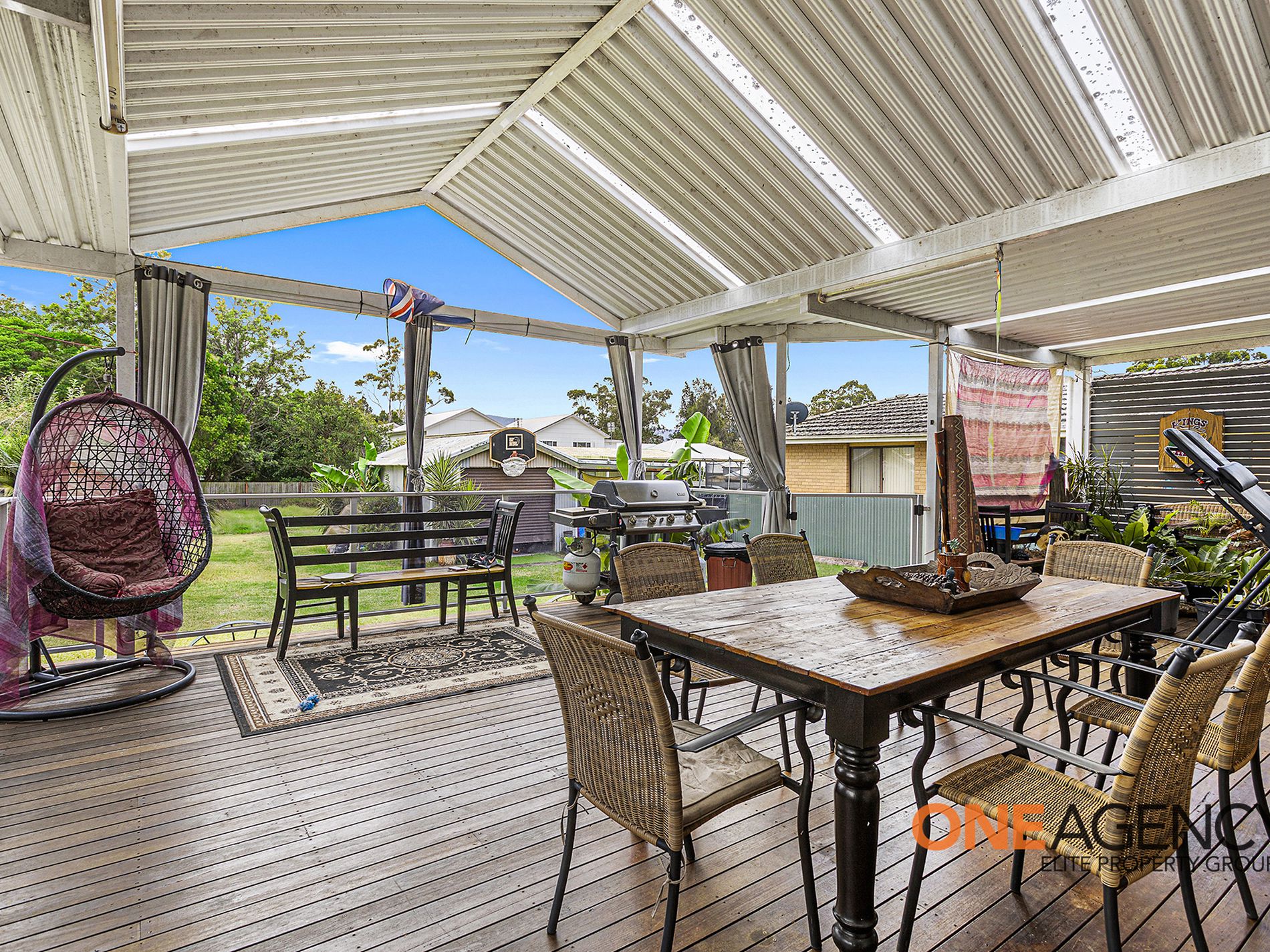 Peaceful and serene within the homes layout, all three bedrooms display generous built-in wardrobes throughout and congregate around a bright bathroom with tub plus shower. The rear facade of the home faces north and is gloriously extended by a vast all-seasons entertainers deck overlooking the flat, park-like backyard.